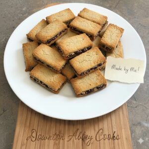 The biscuits haven’t changed much since. Two thin layers of golden dough, a generous filling of currants pressed between them, a light glaze of sugar on top. Simple, practical, and built to last in a tin—precisely the sort of biscuit Mrs Patmore would have kept on hand for the servants’ hall.